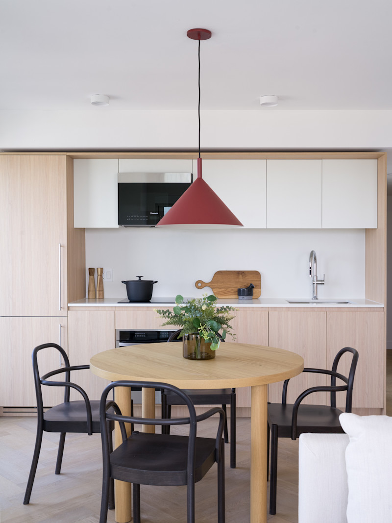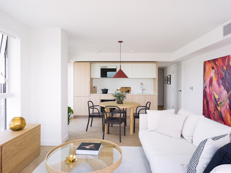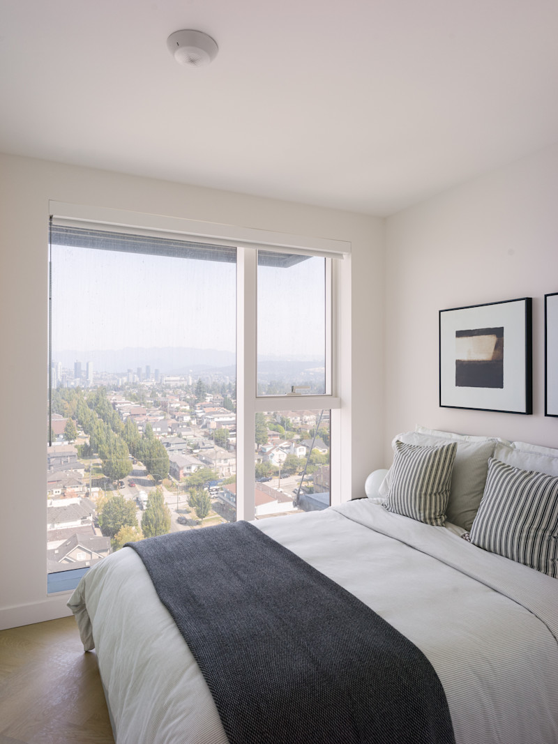 Our latest rental residential tower in the Joyce-Collingwood Neighbourhood is across the street from Joyce I and the Sky Train station. Inspired by the active and dynamic Joyce Street, the design of Joyce II is influenced by the heritage of northwest modernist lightweight structural systems, balconies of steel outriggers, nautical concepts and contemporary prefabrication. The resulting tower's elegant vertical form dynamically shifts at the podium, mid-point, and top, creating dramatic tension points, addressing the contextual environment of Joyce Street, the North shore mountains and downtown Vancouver.