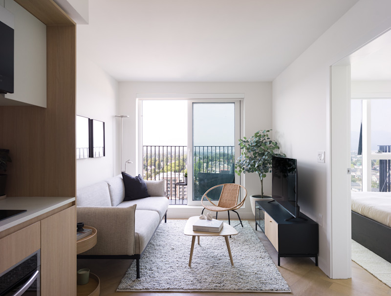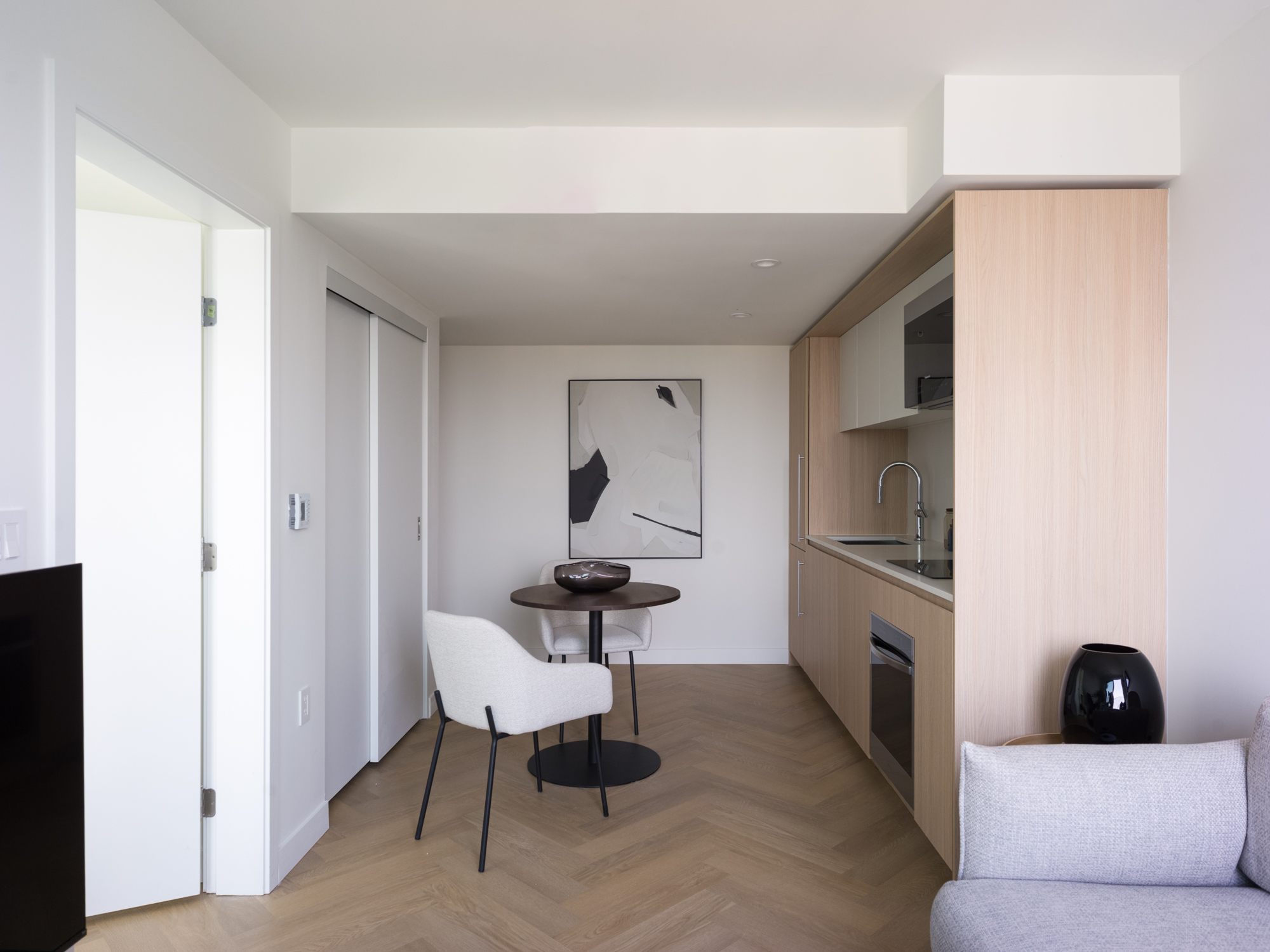 The tower base features a series of retail spaces and a lobby oriented to Joyce Street. A welcoming public lobby oriented to the new public plaza and SkyTrain will lead the community into the building, while the amenity program at the top of the tower offers indoor lounge and roof deck featuring panoramic views.